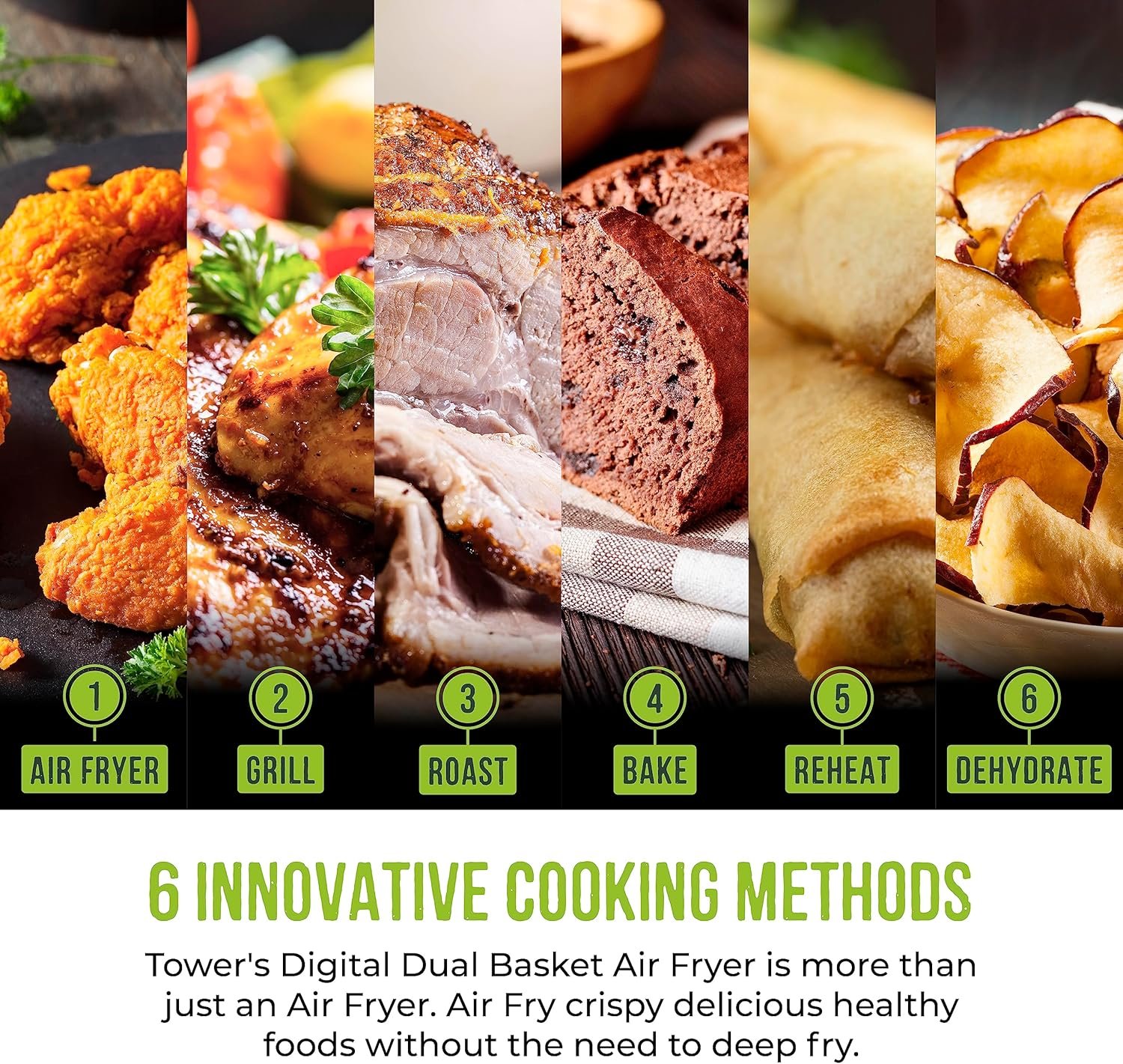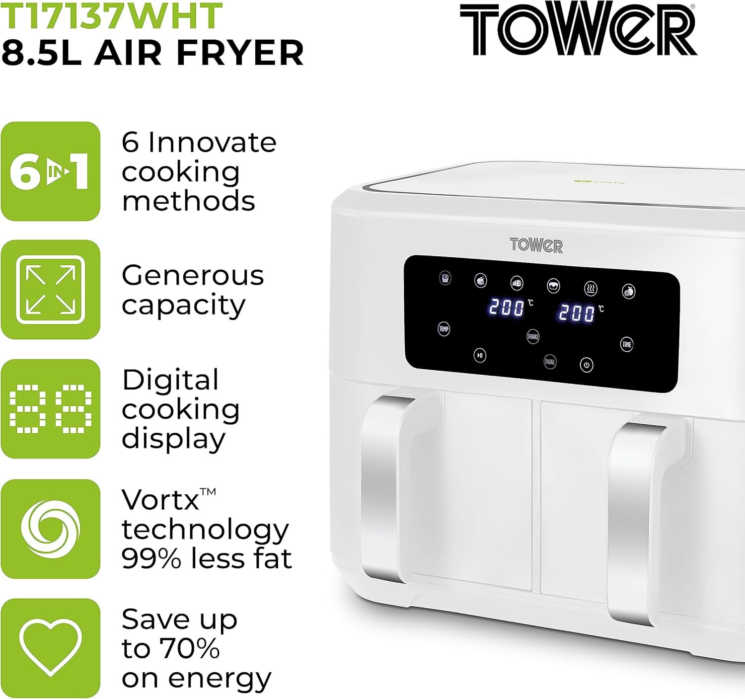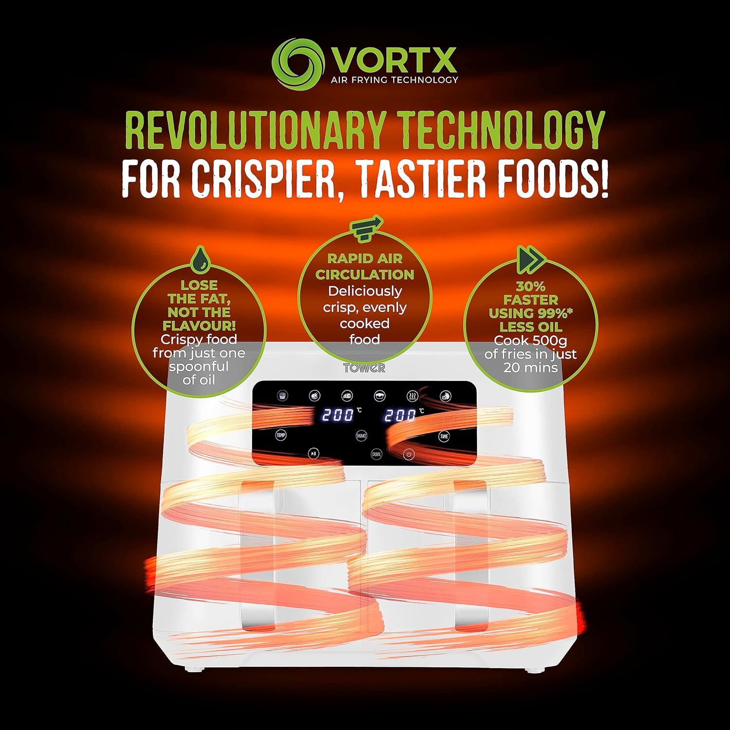 - VORTX AIR FRYING TECHNOLOGY: Exclusive to Tower Air Fryers Vortx technology rapidly circulates hot air around food cooking up to 30% faster than a conventional oven. Vortx also cooks food with a delicious crispy texture and because little or no oil is required it’s much healthier too! Lose the fat not the flavour with Vortx Air Frying Technology