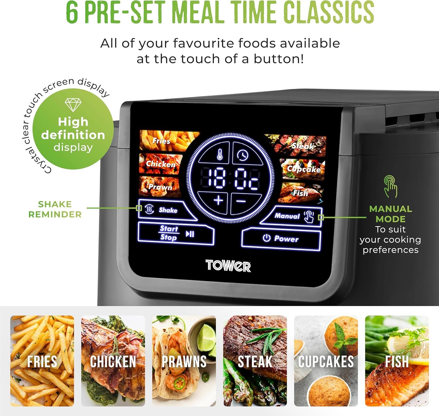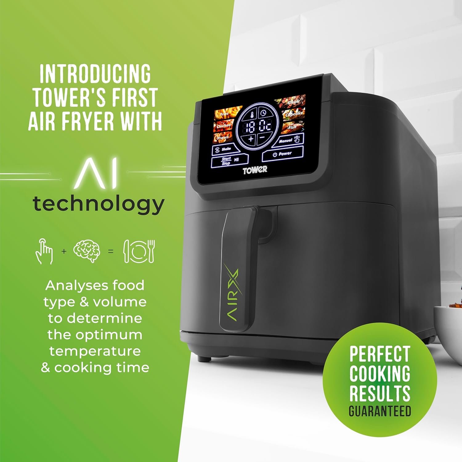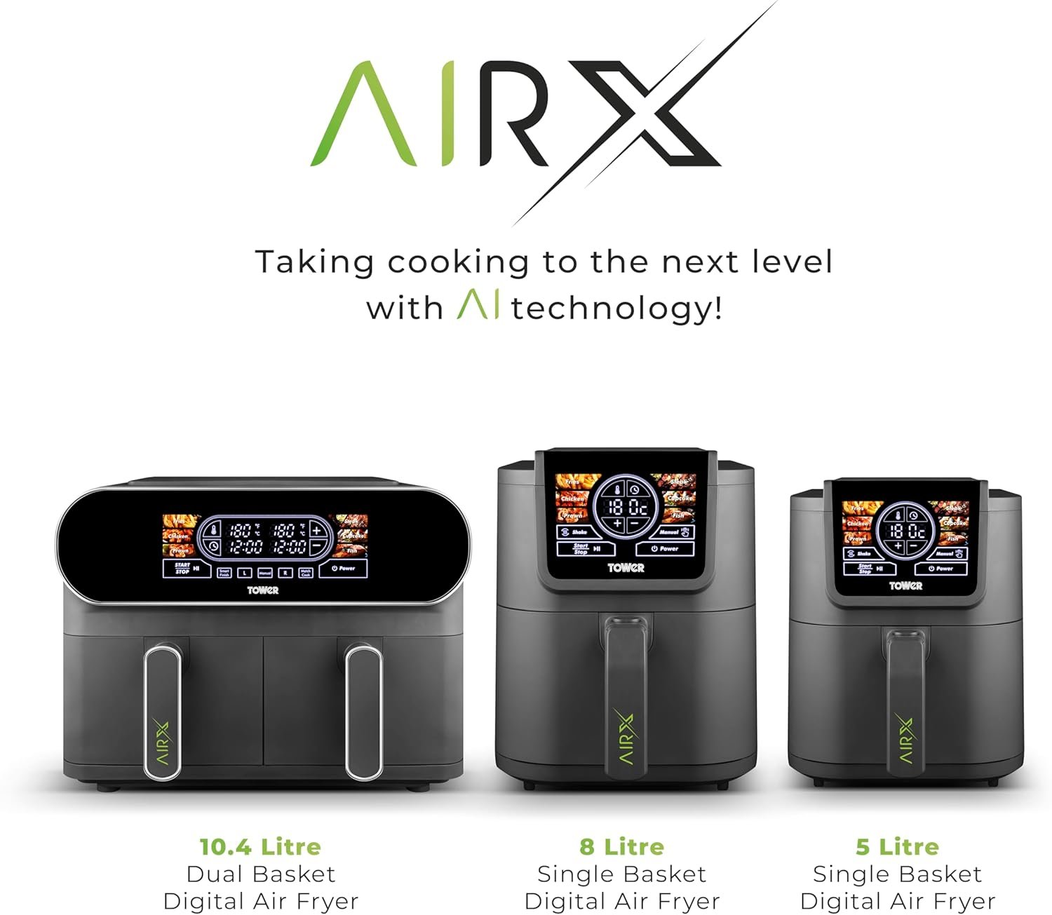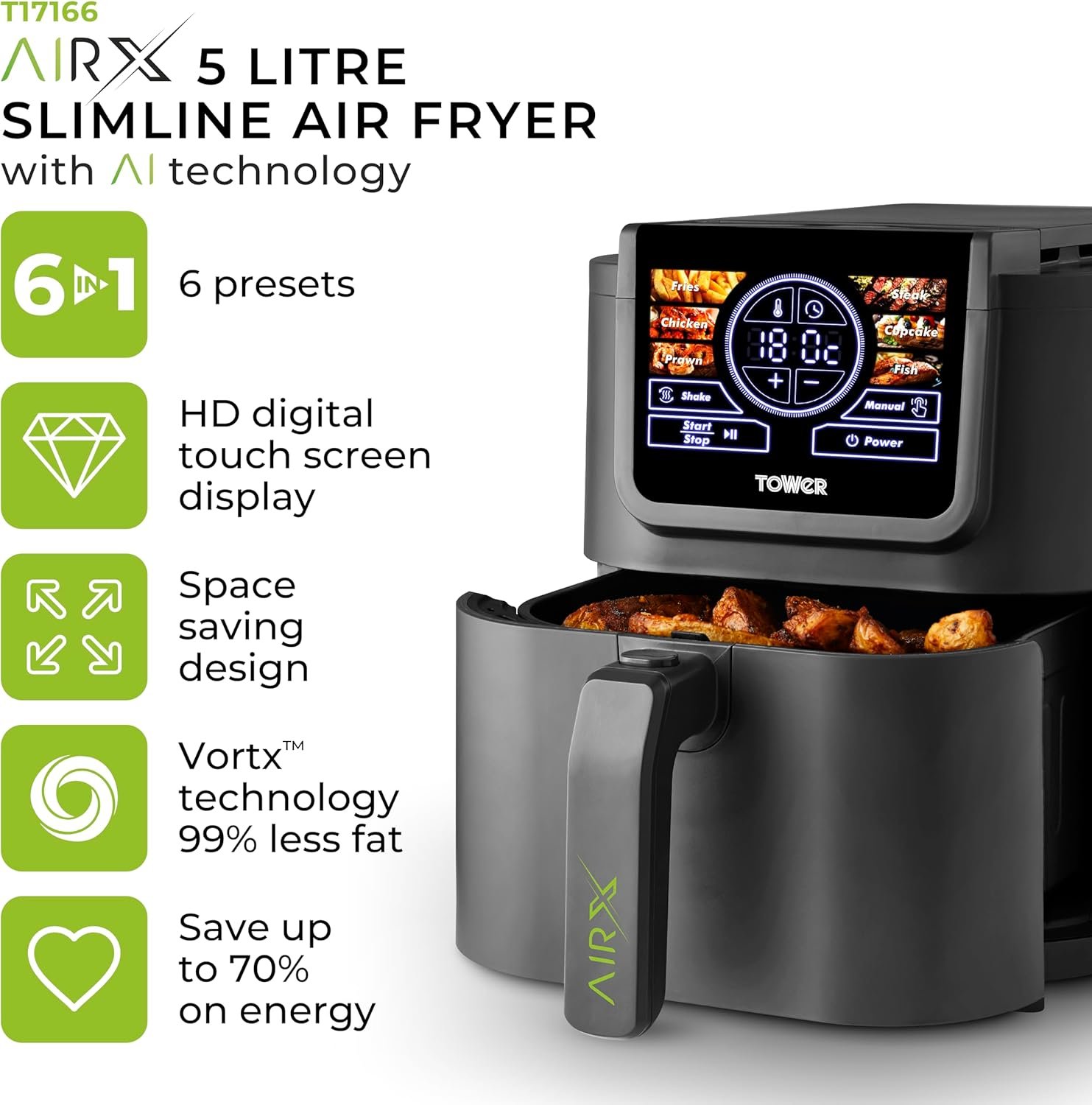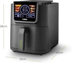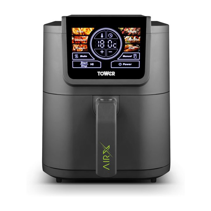 Tower T17166 AIRX 5L Digital Single Basket Air Fryer with A.I & Vortx Technology. 6 Cooking Pre-sets. Space Saving Design. 60 Minute Timer. 1500W. Grey