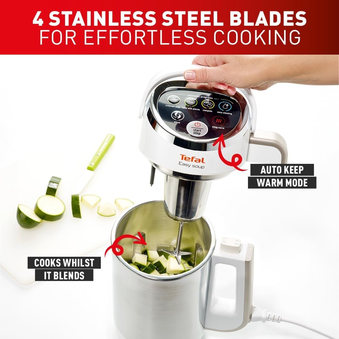 Tefal Easy Soup and Smoothie Maker. 1.2 L Jug. 5 Programs. Smooth/Chunky Soup. Smoothie. Compote. Auto-Clean. 1000W. Digital Control. Stainless Steel. BL841141