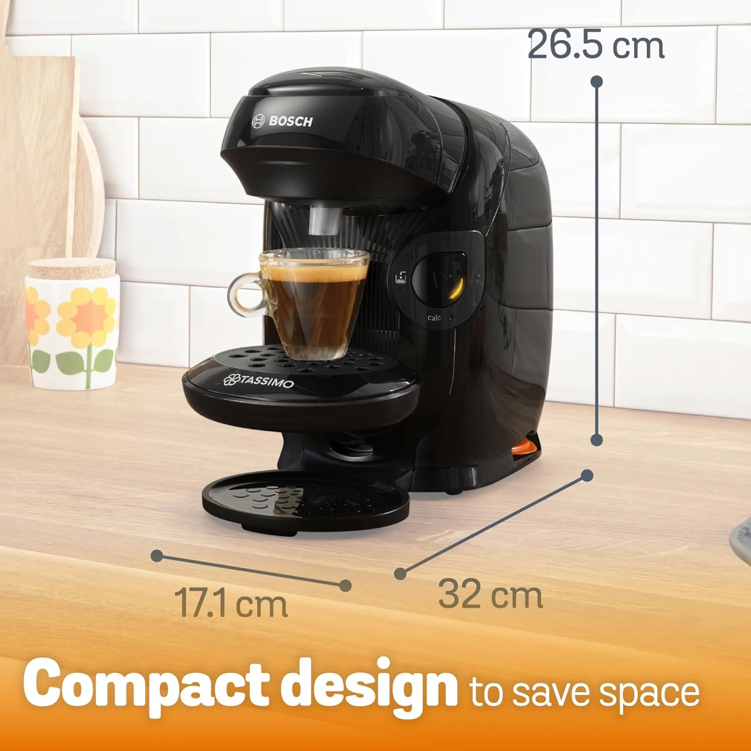 Small kitchen? No problem! The TASSIMO STYLE is compact and fits in any kitchen. saving space for other appliances or items.