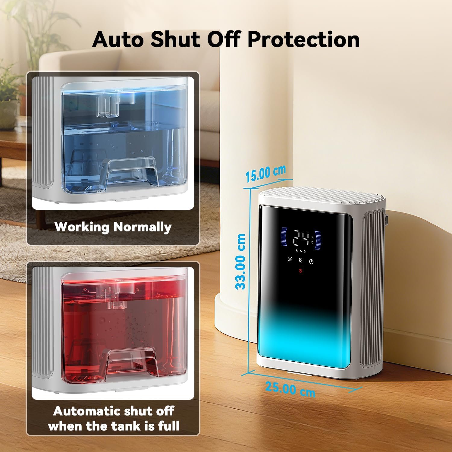 - 【3000ML Transparent Water Tank and Touchscreen】- This dehumidifier comes with a large. transparent 3000ml water tank that automatically shuts down for protection when full. It also features integrated. hidden touch buttons that illuminate with soft backlighting. eliminating harsh pressure and lag. Whether you’re adjusting the mode in the bedroom before bed or switching the lighting when entertaining guests. you can enjoy a worry-free. efficient dehumidification experience while enjoying the smooth. premium feel and visual experience of a light touch. making it a perfect choice for any home that demands a quality lifestyle.
