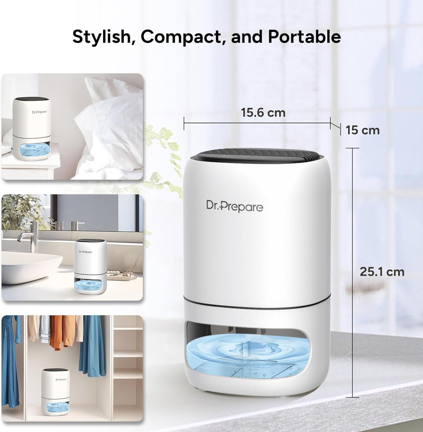 - 【Easy to Carry and Use】 A modern rounded portable dehumidifier with touch controls. The back carry handle allows you to move from room to room. Preset running time with the 4H/8H/12H timer function. Small and sleek. perfect for removing moisture from your home. kitchen. bathroom. bedroom. caravan. garage. or basement.