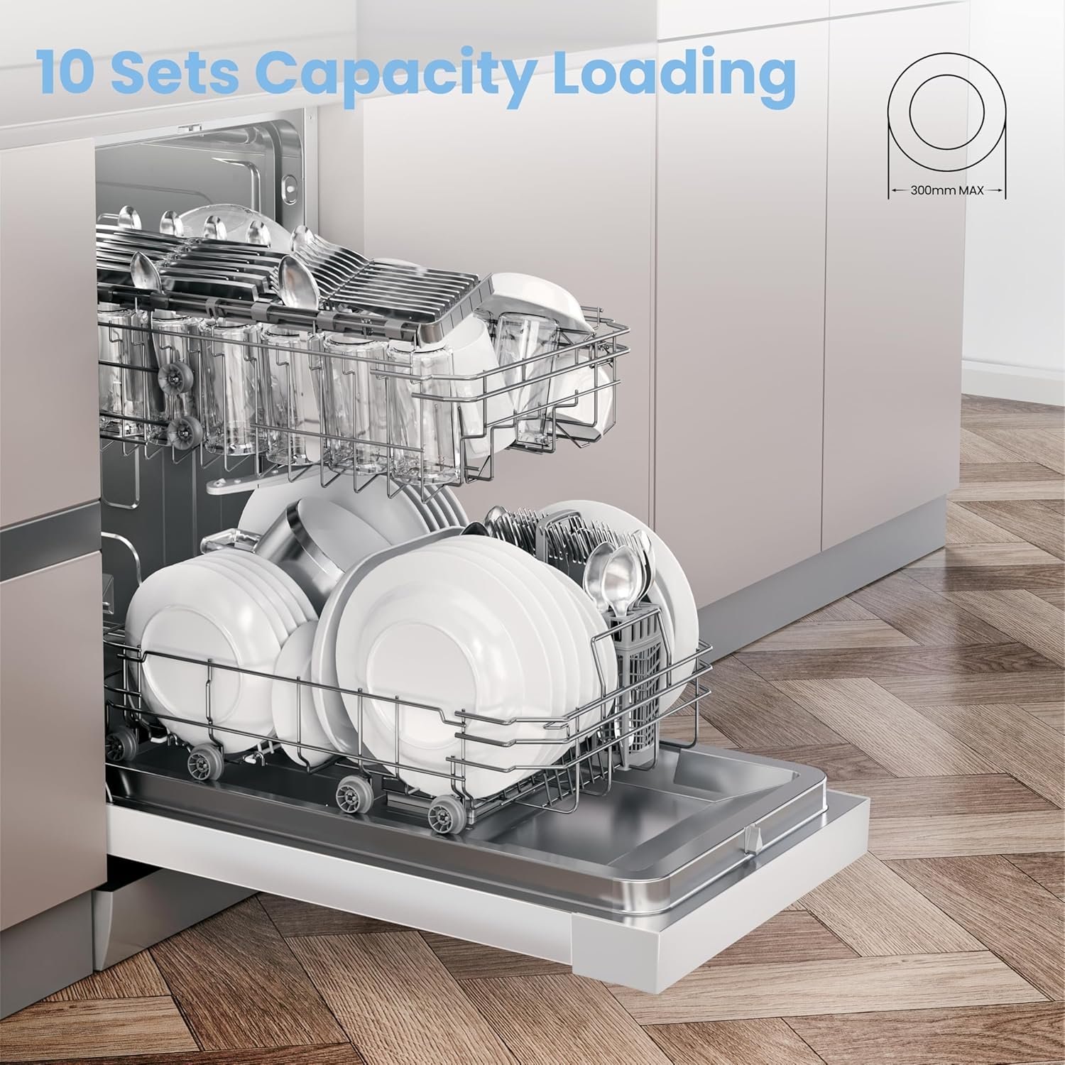 - 【10 Place Settings】With a slim body. it takes up less space and is easy to fit whether it’s free-standing or built-in. It’s also has been considerately designed to accommodate larger plates. pots & pans up to 300mm in diameter