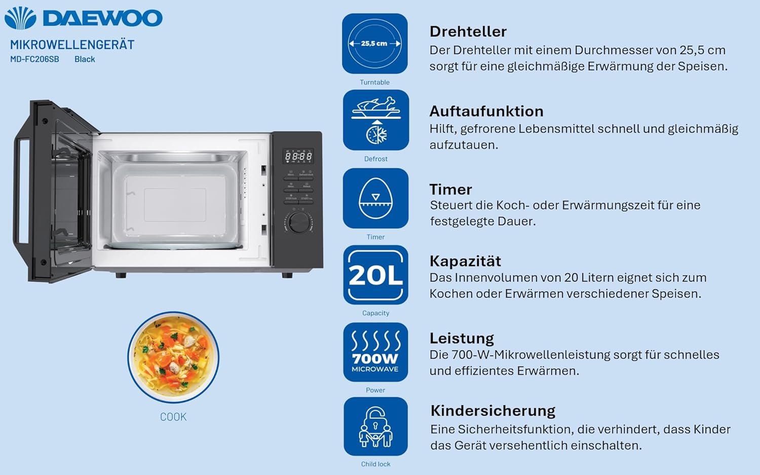 - 700 W microwave power – for fast heating of your dishes