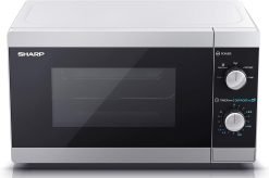 The SHARP YC-MS01U-S 800W mechanical control microwave offers a contemporary look with a handleless design with a sleek silver finish complemented by a black door window and control panel. the perfect addition to any kitchen.