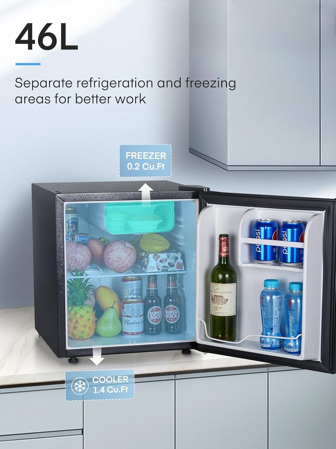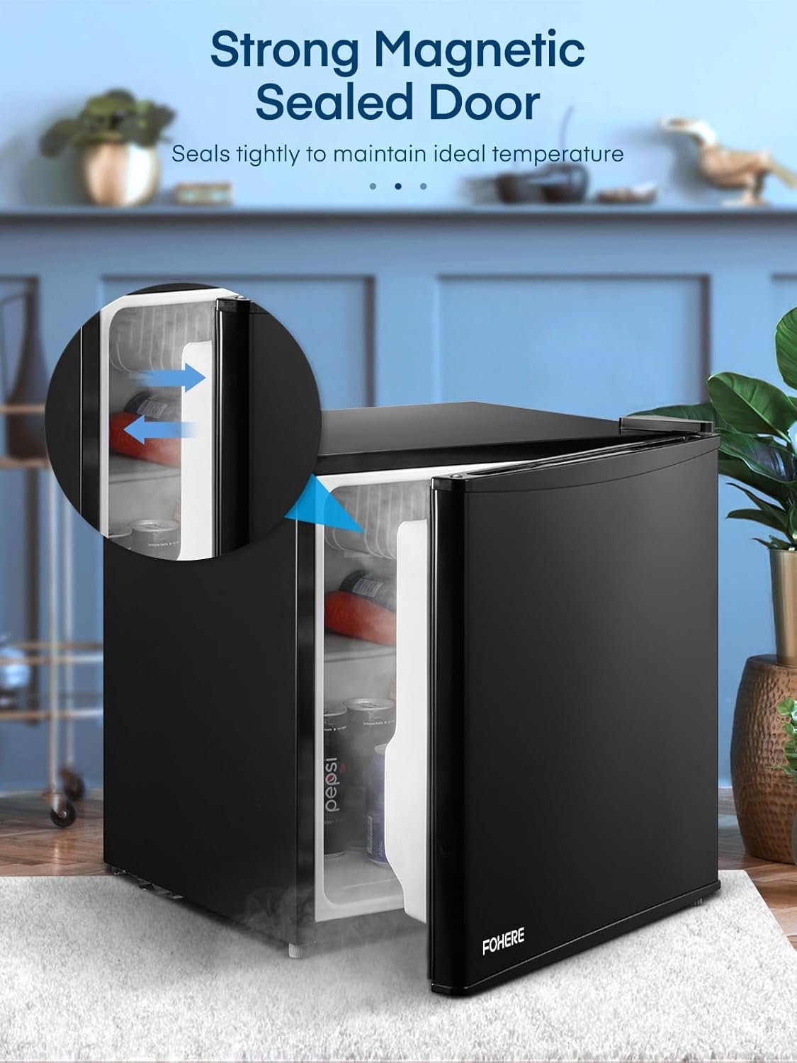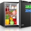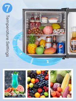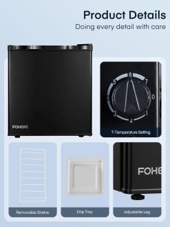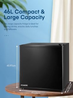 FOHERE Mini Fridge 46L. E Energy Rating. Table Top Fridge. Reversible Door. Adjustable temperature. Built in Ice Box. Compact Wine&Beers Cooling. Black