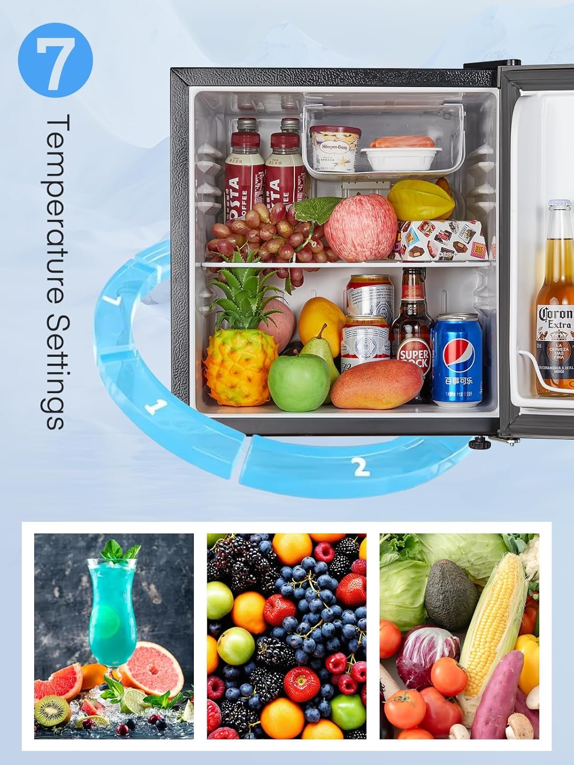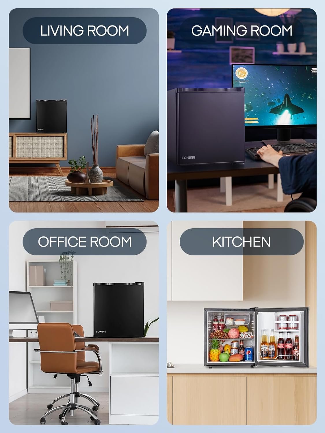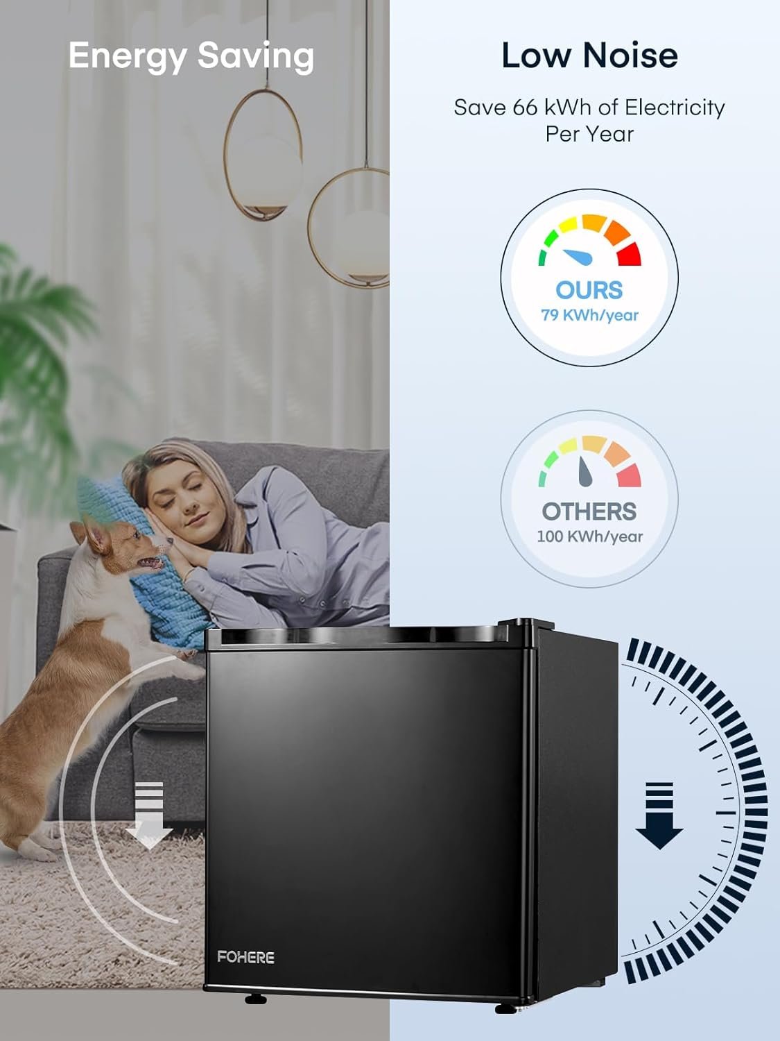 FOHERE Mini Fridge 46L. E Energy Rating. Table Top Fridge. Reversible Door. Adjustable temperature. Built in Ice Box. Compact Wine&Beers Cooling. Black