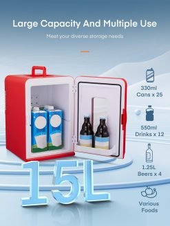 Mini Fridge 15 Liter/21 Cans. Portable AC+DC Power Small Fridge for Bedroom. Car. Office. Thermoelectric Cooler and Warmer Skincare for Food. Drinks. Cosmetics. Max & ECO Mode