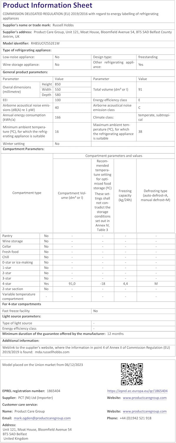 - 2 YEAR GUARANTEE – For added peace of mind. this Russell Hobbs Freezer comes with a 2 Year Guarantee upon registration. This way. in the unlikely event something goes wrong. you know we’ll always be on hand to help DIMENSIONS – (H) 85 x (W) 55 x (D) 58 CMs WEIGHT – 29Kg